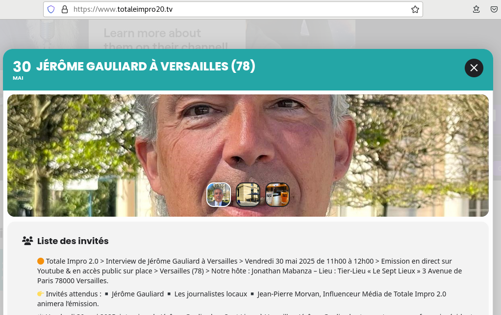 🟠 Totale Impro 2.0 > Interview de Jérôme Gauliard à Versailles > Vendredi 30 mai 2025 de 11h00 à 12h00 > Emission en direct sur Youtube & en accès public sur place > Versailles (78) > Notre hôte : Jonathan Mabanza – Lieu : Tier-Lieu « Le Sept Lieux » 3 Avenue de Paris 78000 Versailles.